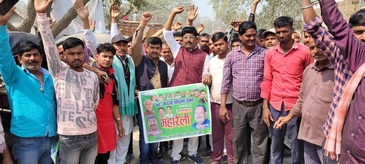 जदयू प्रखंड अध्यक्ष की अध्यक्षता में महागठबंधन की रैली में कदवा से निकली जदयू कार्यकर्तओं की जत्था ।