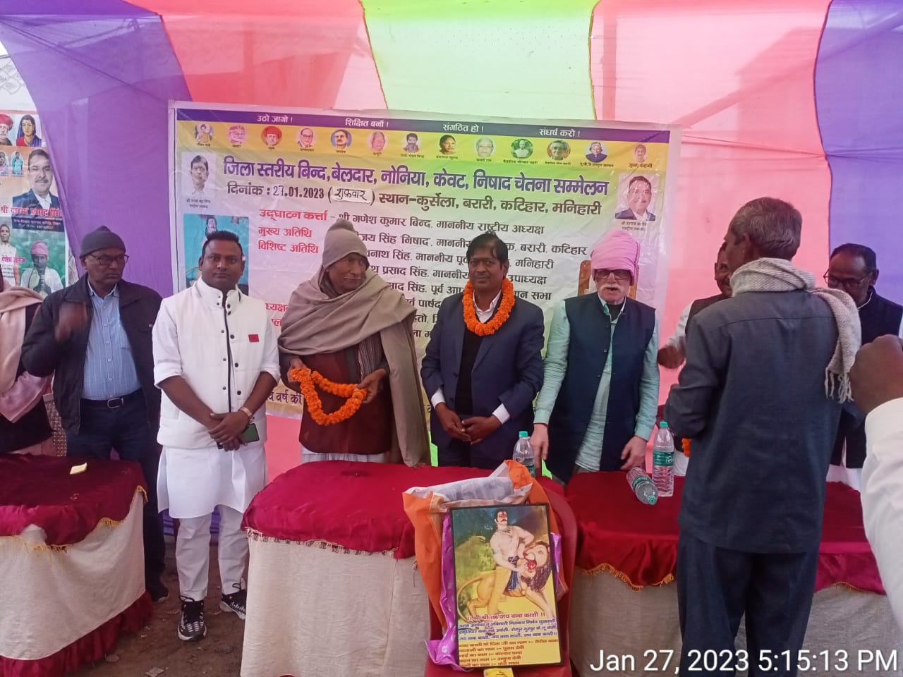 बिंद , बेलदार, नोनिया, केवट, निषाद समुदाय की भारत की प्राचीनतम एवं मूल निवासी हैं।सूबे मे निषाद समुदाय की जनसंख्या 14 प्रतिशत है,जिसमें बिंद बेलदार जाति 8 प्रतिशत है।विगत सात दशकों तक राजनीति मे इनका विभिन्न राजनीतिक दलों ने वोट बैंक के रुप मे इस्तेमाल किया। यह समुदाय आज भी सामाजिक, शैक्षणिक, आर्थिक एवं राजनीतिक दृष्टि भी हासिये पर है। इन्हें इनका अधिकार – न्याय दिलाने को लेकर पटना के गांधी मैदान मे पांच फरवरी को बिंद – बेलदार चेतना को लेकर सम्मेलन का आयोजन किया गया है।इस आशय की जानकारी बिंद विकास सामाजिक सेवा संस्थान एवं बिंद -बेलदार समन्वय समिति के राष्ट्रीय अध्यक्ष गणेश कुमार ने दी है। राष्ट्रीय अध्यक्ष शुक्रवार को जिले के कुरसेला, बरारी, कटिहार प्रखंड मे बैठक कर मनिहारी स्टेशन के पीछे बिंद -बेलदार सम्मेलन मे भाग लेने को ले लक्ष्ति समुदाय का आह्वान करने पहुंचे थे।बैठक मे मुख्य अतिथि के रुप मे मनिहारी के पूर्व विधायक जनप्रिय समाजवादी नेता विश्वनाथ सिंह उपस्थित थे।अपने विधायक कार्यकाल मे श्री सिंह ने कुल देवता बाबा काशी की भव्य पूजा अर्चना कर निषाद समुदाय की विभिन्न उपजातियों मे बटे कुनबे को एक जुट करने का प्रयास किया था।अपने संबोधन मे श्री सिंह ने बिंद -.बेलदार समुदाय के लोगों से बड़ी संख्या मे पांच फरवरी को पटना मे आयोजित विशाल चेतना सम्मेलन व कुल देवता काशी बाबा के पूजनोत्सव मे भाग लेकर चट्टानी एकता प्रदर्शित करने का आह्वान किया।इस मौके पर राष्ट्रीय अध्यक्ष गणेश कुमार ने बताया कि सम्मेलन के माध्यम से टुकड़े-टुकड़े मे बटे समाज को एकजुट कर जन चेतना लाना है।सामाजिक, राजनीतिक, शैक्षणिक, आर्थिक रुप से हासिये पर खड़ी उक्त समुदाय को उनका हक दिलाना कार्यक्रम का उद्देश्य है।इनकी मांगों मे बिंद -बेलदार -नोनियाऔर केवट आदि निषाद समुदाय की जातियों को अनुसूचित जाति, जनजाति मे शामिल किया जाय।उक्त जातियों के गरीब ,भूमिहीन, विस्थापित, आवास विहीन परिवारों को आवास उपलव्ध कराया जाना, गरीब परिवारों व विधवा महिलाओं को प्रतिमाह पेंशन व मुफ्त अनाज उपलब्ध कराये जाएं। इस मौके पर संगठन के बाल्मीकि प्रसाद, शिव रतन प्रसाद, उपेन्द्र प्रसाद, दशरथ प्रसाद, विजय कृष्ण सिंह, बिंद सेना के राष्ट्रीय सचिव युवा नेता राज शेखर सिंह सहित अनेक वक्ताओं ने अपने विचार रखे।