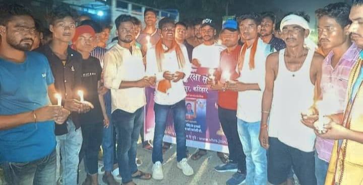 बलरामपुर/कटिहार—- दुमका की बेटी की पेट्रोल छिड़कर जिंदा जलाकर निर्मम हत्या के विरोध में हत्यारे को फांसी देने के मांग को लेकर मंगलवार की देर शाम विभिन्न सामाजिक संगठन द्वारा बलरामपुर पेट्रोल पंप से लेकर तेलता मोर तक में कैंडल मार्च निकाला गया। कैंडल मार्च के नेतृत्व बिहिप के अध्यक्ष दीपक शर्मा एवं एबीवीपी के प्रदेश कार्यकारिणी सदस्य बिनोद कुमार कुशवाहा , प्रखंड सह संयोजक अमृत सिंह ने किया । इस दौरान संगठन के सदस्यों द्वारा 2 मिनट का मौन रखकर उनकी आत्मा की शांति के लिए श्रद्धांजलि अर्पित की गई। कैंडल मार्च के दौरान झारखंड सरकार के खिलाफ जमकर नारेबाजी की गई। उपस्थित लोगों में मुख्य रूप से गौरव शर्मा , सुदर्शन सिंह, सुकून कुमार दास, सोनू शर्मा , रवि सिंह , नीरज शर्मा सहित दर्जनों लोग शामिल रहे।