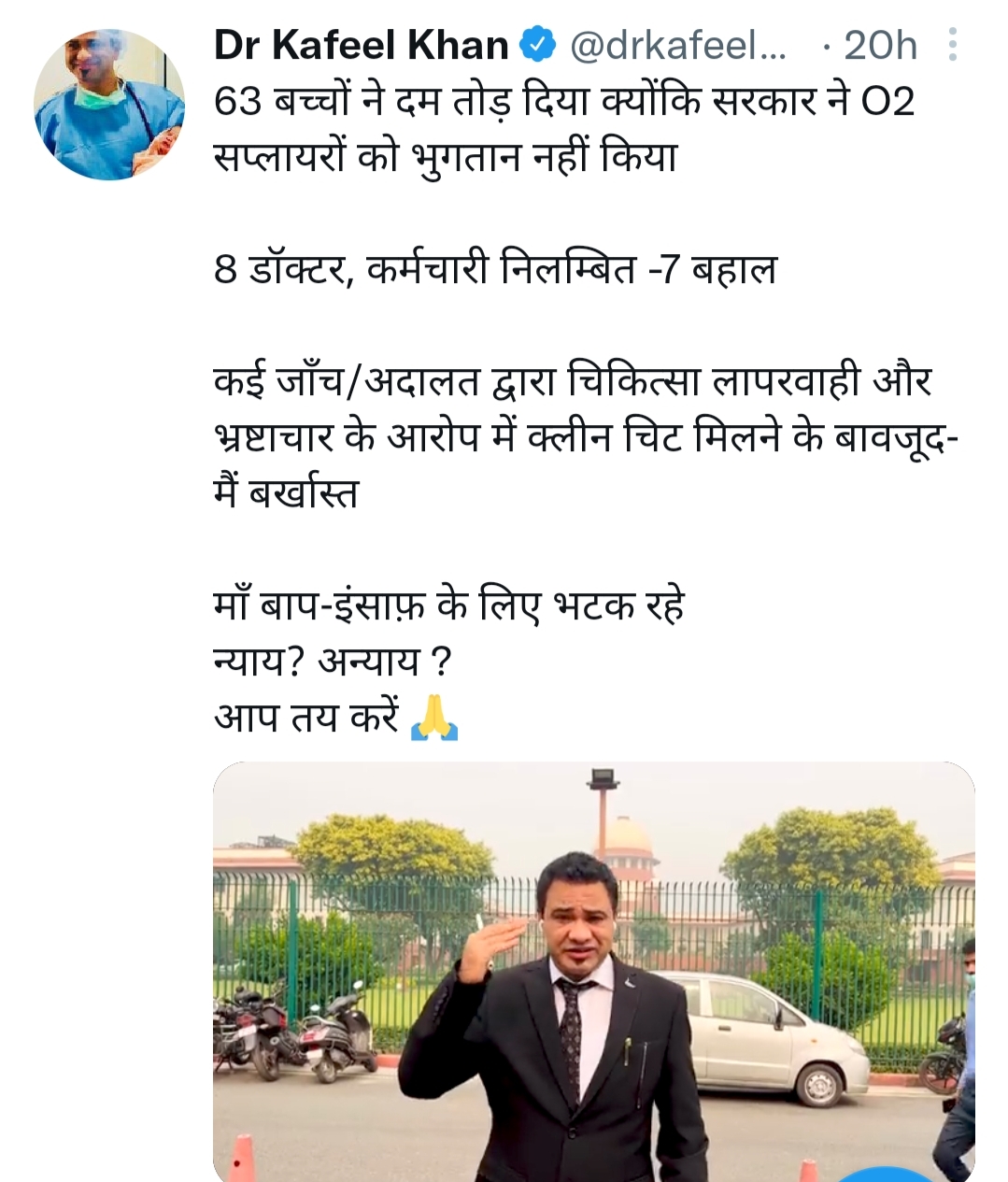 अपनी बर्खास्तगी पर बोले डॉ कफील “न्याय – अन्याय” आप तय करें
