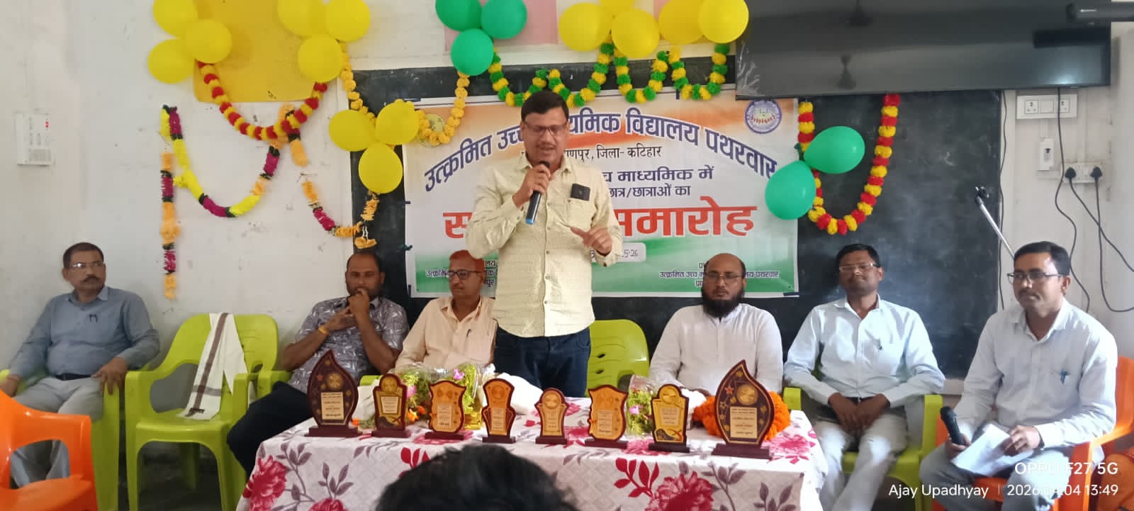 माध्यमिक एवं उच्च माध्यमिक विद्यालय पथरवार में शनिवार को प्रथम श्रेणी से उत्तीर्ण छात्र-छात्राओं का सम्मान समारोह आयोजित किया गया। मुख्य अतिथि के रूप में स्थानीय मुखिया प्रमोद मेहता थे। कार्यक्रम का संचालन विद्यालय के शिक्षक संजय कुमार मंडल ने किया। मुख्य अतिथि स्थानीय मुखिया ने माध्यमिक में उत्कृष्ट प्रदर्शन करने वाले छात्र छात्राओं बिनती कुमारी,सोनू कुमार, रवि मुर्मू, राजा शर्मा, रिया कुमारी एवं उच्चतर माध्यमिक में आर्यन कुमार,उजमा बानू एवं दीपक कुमार को पुरस्कार देकर सम्मानित किया।उत्क्रमित उच्च माध्यमिक विद्यालय पथरवार के प्रधानाध्यापक मुस्ताक अहमद नदवी ने संबोधित करते हुए कहा कि विद्यालय के विद्वान शिक्षकों एवं छात्र-छात्राओं की मेहनत का परिणाम से पूरा पथरवार पंचायत गौरवान्वित है। विद्यालय में पठन-पाठन करने वाले बच्चों में उत्साह चरम पर है।आगामी परीक्षा में भी अच्छे परिणाम आने की उम्मीद है। उत्क्रमित उच्च माध्यमिक विद्यालय के केहटा बालूगंज के प्रधानाध्यापक मधुकर कुमार ने उत्क्रमित उच्च माध्यमिक विद्यालय पथरवार सह उत्क्रमित मध्य विद्यालय केहटा बालूगंज के सभी शिक्षकों एवं छात्र-छात्राओं को उज्जवल भविष्य की कामना की। कार्यक्रम को स्थानीय उप मुखिया राजू शर्मा,डॉक्टर श्रीनिवास गुप्ता,शिक्षक सुनील कुमार,पीतांबर कुमार मंडल,सबा कलाम, खुशबू कुमार,श्वेता कुमारी,संजय कुमार मंडल,परवेज आलम,निलेश कुमार,रंजना भारद्वाज,कमल कुमार,जीवन कुमार, नीतू कुमारी ने संबोधित किया। इस मौके पर विद्यालय पोषक क्षेत्र के अभिभावक गण एवं छात्र-छात्रा काफी संख्या में उपस्थित थे। कार्यक्रम में मैट्रिक एवं इंटर में प्रथम श्रेणी से उत्तीर्ण छात्र छात्राओं के माता-पिता को भी सम्मानित किया गया।