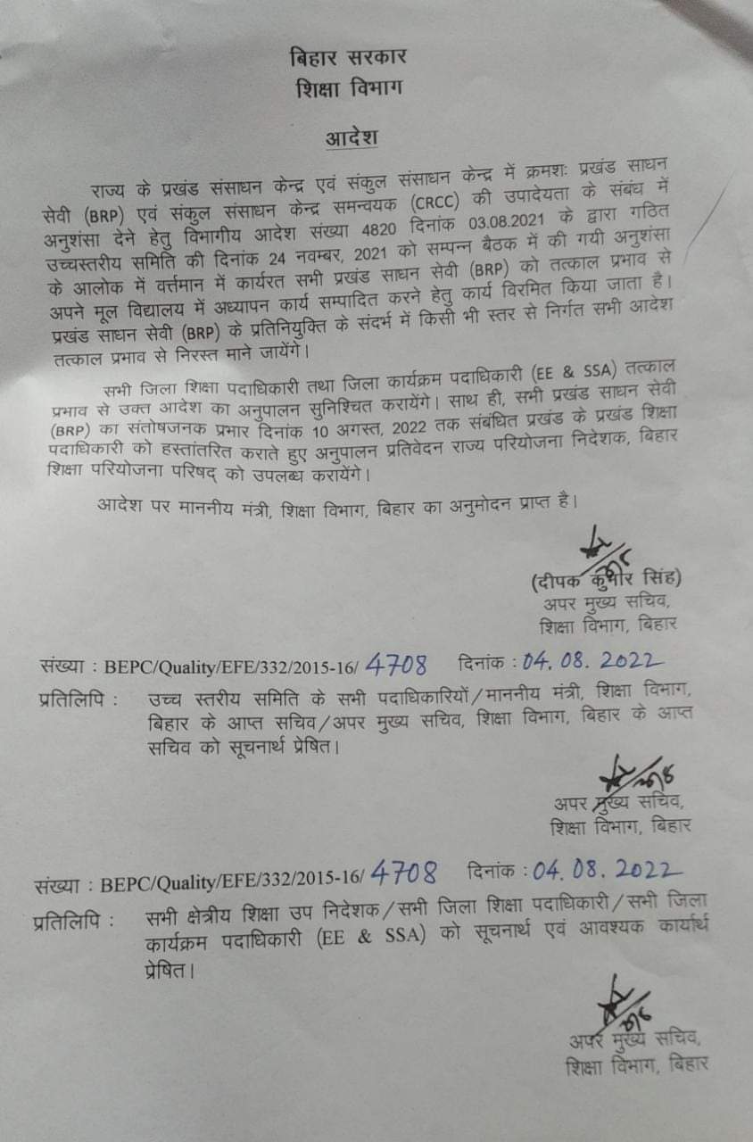 शिक्षा विभाग द्वारा पूर्व में भी कार्यरत सभी CRCC एवं BRP के प्रतिनियुक्त कर्मियों को अपने मूल विद्यालय में योगदान देने का आदेश दिया गया था जिसके आलोक में राज्य के कई प्रखंडों में CRCC अपने विद्यालयों में वापस योगदान के बाद भी कई प्रखंडों में वर्तमान में BRP कार्यरत थे । इन मुद्दों पर लगातार कई शिक्षक संघों के द्वारा इन्हें हटाने की मांग संबंधित शिकायत दर्ज कराई गई थी। इस पर बिहार सरकार के शिक्षा विभाग के अपर मुख्य सचिव दीपक कुमार सिंह ने 4 अगस्त 2022 को एक आदेश पत्र जारी कर पूरे बिहार राज्य के CRCC व BRP को तत्काल प्रभाव से अपने मूल विद्यालय में योगदान देने का पत्र निर्गत कर दिया है । जानकारी के मुताबिक कटिहार जिले में भी कई बीआरपी अब भी प्रखंड संसाधन केंद्रों में कार्यरत है अब देखना यह है जिला शिक्षा पदाधिकारी ऐसे CRCC एवं BRP पर क्या कार्रवाई करते हैं ।