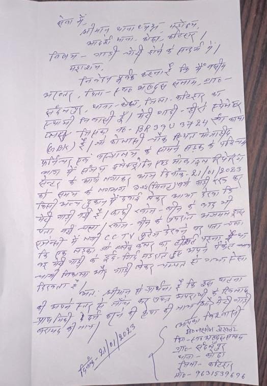 कटिहार जिले के कोढ़ा थाना क्षेत्र के कोलासी बाजार से अज्ञात व्यक्ति द्वारा बाइक चोरी की घटना को अंजाम देकर चंपत होने के मामले पुलिस छानबीन में जुट गई है । घटना को लेकर पीड़ित मो० नसीम अख्तर के द्वारा एक लिखित आवेदन कोढ़ा थाना अध्यक्ष को सौंपते हुए न्याय की गुहार लगाई है । दिए गए आवेदन में उन्होंने लिखा है कि शनिवार दोपहर लगभग 3 बजे उनका बाइक जिसका न० BR-39- U3724 चोरी हो गई है । आगे उन्होंने लिखा है कि वह कोलासी बाजार स्थित संजय इलेक्ट्रॉनिक एंड मोबाइल रिपेयरिंग सेंटर के सामने सड़क किनारे अपना स्प्लेंडर बाइक लगाकर शनिवार दोपहर लगभग 3 बजेेे दवाई लेने हेतु किसी दुकान में गए थे । दवाई लेकर जब पुनः वापस लौटा तो देखा कि वहां पर उसकी गाड़ी नहीं है । अपनी गाड़ी को गायब देखकर काफी परेशान हो गया और अपनी गाड़ी की खोजबीन करने लगा । काफी खोजबीन के उपरांत बाजार स्थित अजमल ड्रग एजेंसी में लगे सीसीटीवी का फुटेज को देखने पर पता चला कि एक अज्ञात लड़का जो ब्लैक कलर का टीशर्ट पहना है वह उनके गाड़ी के इर्द-गिर्द घूम रहा था इसी दौरान वह अपने पॉकेट से चाबी निकाला और गाड़ी को लेकर फरार हो गया ।वही इस संबंध में कोढ़ा थानाध्यक्ष रूपक रंजन सिंह नेे दुरभाष पर बताया कि मामला दर्ज कर लिया गया है और अपराधी की पहचान हेतु पुलिस छानबीन कर रही है ।