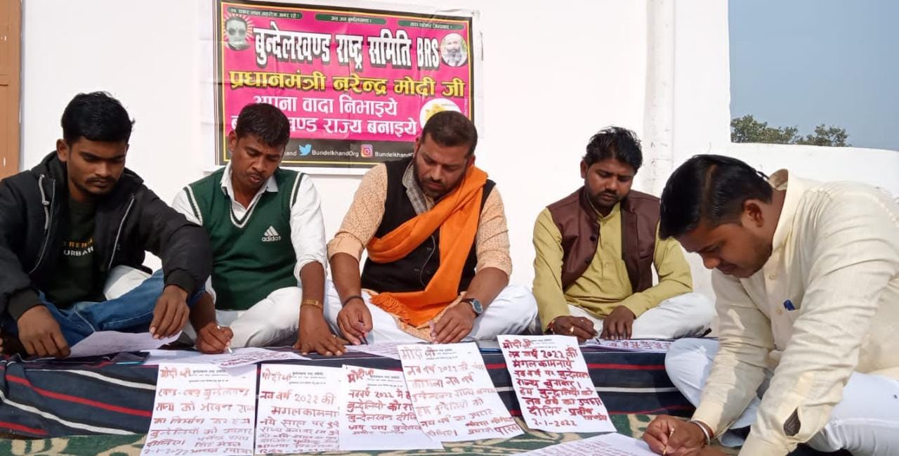 बुन्देलखण्ड राष्ट्र समिति के केंद्रीय अध्यक्ष प्रवीण पाण्डेय के नेतृत्व में परिक्रमा के बाद प्रधानमंत्री नरेंद्र मोदी को 26वी बार खून से पत्र लिखा गया l बुंदेलखंड राष्ट्र समिति के केंद्रीय अध्यक्ष प्रवीण पाण्डेय ने पत्र में लिखा की नव वर्ष पर प्रधानमंत्री मोदी जी उपहार में बुंदेलखंड राज्य देकर बुंदेली अस्मिता की रक्षा करें l हमीरपुर के पुष्पेंद्र सैनी ने पत्र में लिखा कि मोदी जी , बुंदेलखंड को उत्तर प्रदेश व मध्यप्रदेश के बंधन से मुक्ति कब मिलेगी ? मंडल अध्यक्ष धर्मेंद्र सिंह ने लिखा मोदी जी अटल जी ने तीन राज्य बनाए, आप बुंदेलखंड राज्य बनाए lमंडल उपाध्यक्ष सूर्यभान लोधी ने लिखा प्रधानमंत्री मोदी जल्दी ही बुंदेलखंड की जनता को अलग राज्य का तोहफा दें । कपिल कुमार ने लिखा हम बुंदेलखंड के लोगों की जनभावनाओं का ख्याल रखते हुए मोदी जी शीघ्र बुंदेलखंड राज्य स्थापित करें l