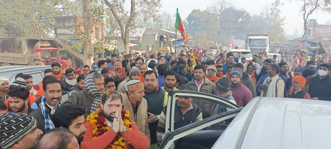 विधानसभा दरियाबाद विधायक प्रत्याशी सतीश चंद शर्मा की जन आशीर्वाद यात्रा में लगे जय श्री राम हर हर महादेव भारत माता की जय के नारे लगे